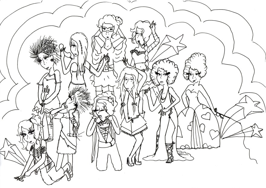 As I got older the dressed up animals progressed and evolved into humans. It may have been because I was saying goodbye to cuddly toys and instead spending my money on new skirts and shoes. It’s only really now that I’m writing this that I realise my art really reflects the progression of my life and the experiences I have had. Currently my love of health and fitness fuel my interest in the human body and have done for about five years now. But at the time I was doodling all of these characters I was only just beginning to get interested in expressing myself through my clothes. I think I drew every outfit I could possibly think of! I had my characters wearing clothes I would never dare to, such as hideously girly pink combinations. I also had them wearing things I wish I had been brave enough to try, such as all sorts of wacky hair styles. It was around this time that my own style was distinctly changing and I was discovering make-up. I had a hideous phase of turquoise eyeliner (what was I thinking?!) and logo T-shirts…So I guess my characters were a reflection of my experimentation with my self-image.