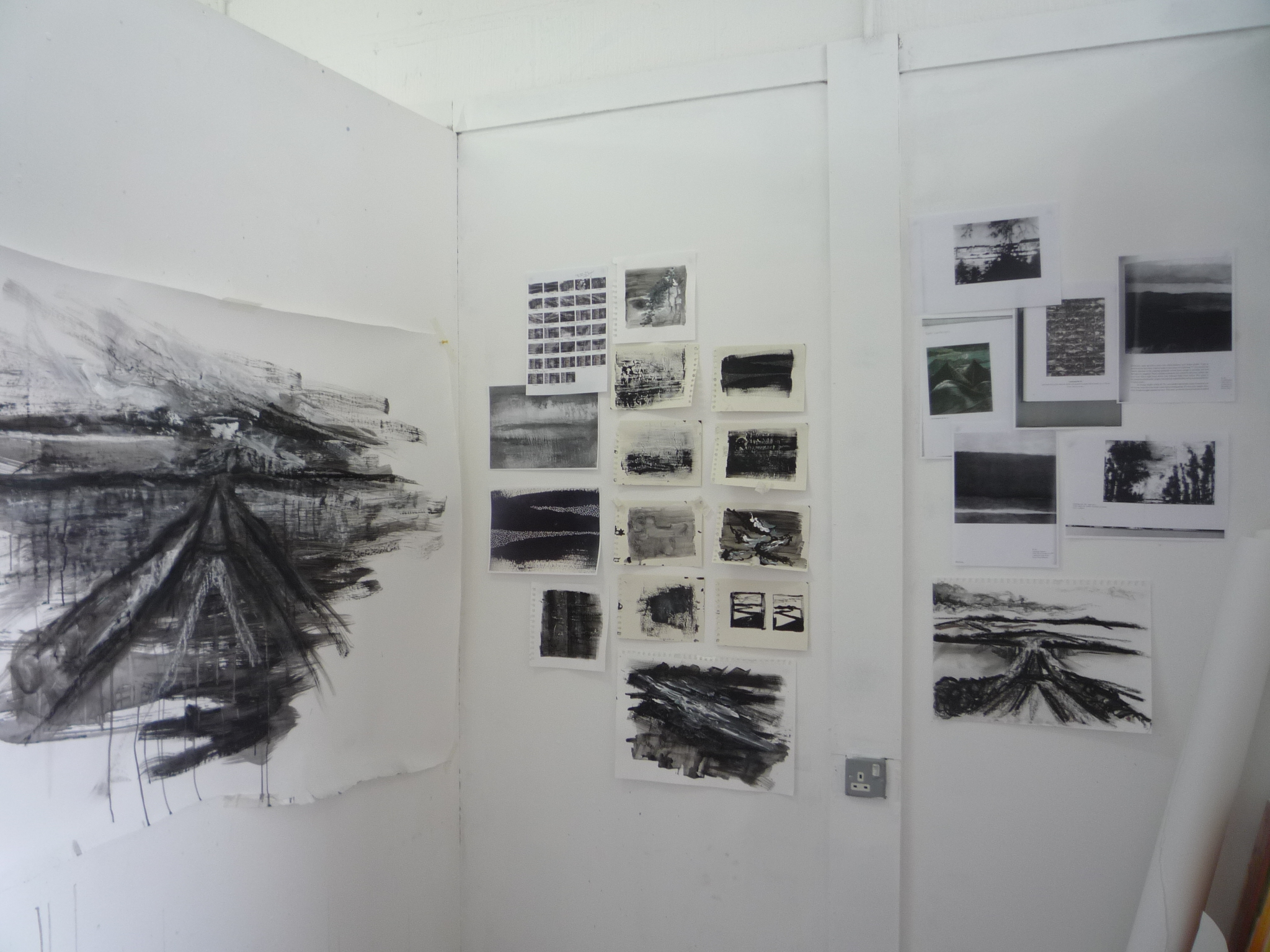 Virtue’s work is purely black and white as well. In first year I came across him and at the time I was painting colourful landscapes using oil and white spirit. So my work was incredibly liquid based – I was even dabbling in egg tempura. Upon discovering Virtue’s work I decided to remove all colour from mine; something I had never done before. And something I will never do again! It really did feel limiting. Yet at the same time it was incredibly refreshing as it forced me to use far more imagination, particularly in the textural sense. I used pins to poke holes in my paper, impasto paste mixed into my paint, allowed my liquids to become far more volatile and fluid. It was however quite a struggle, especially when you look at how stark and colourless my studio became (see below).