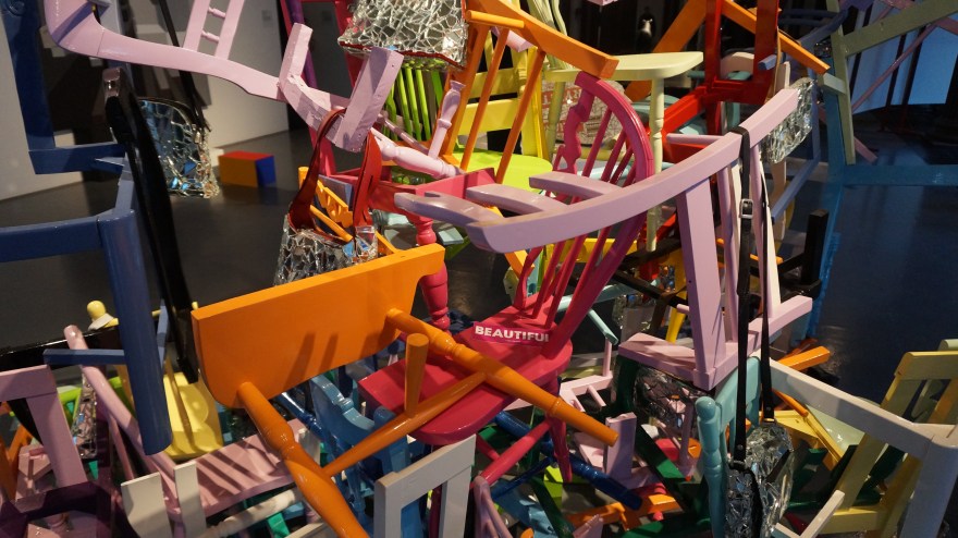 Either way, the colour and apparent clumsiness of this piece instantly appealed to me. What appears as a cluttered and chaotic arrangement of useless half-chairs, is in fact a highly considered and contemplated arrangement. As Eva Hesse would say, “it’s chaos structured as non-chaos”. It’s almost like something Alice would find in Wonderland. There is no sense of guidance for the eye to travel over, it is merely left to its own devices in registering and comprehending the work.